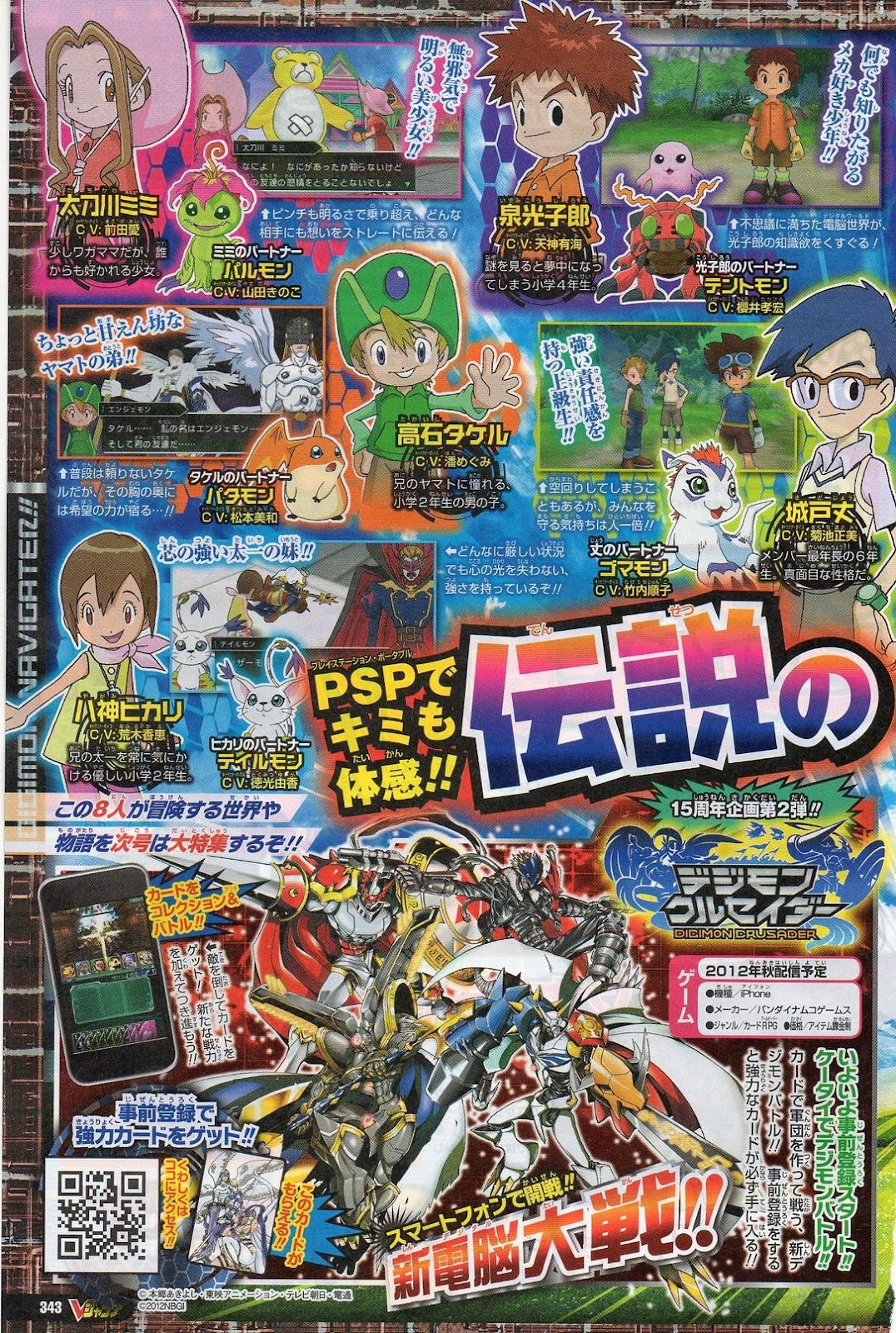 Os scans da edição de Novembro da revista japonesa V-Jump foram já divulgados, mostrando novas informações sobre o jogo de "Digimon Adventure" para a PSP, que será lançado na próxima primavera boreal de 2013, e sobre "Digimon Crusader", que será lançado ainda este ano. Verifiquem abaixo: